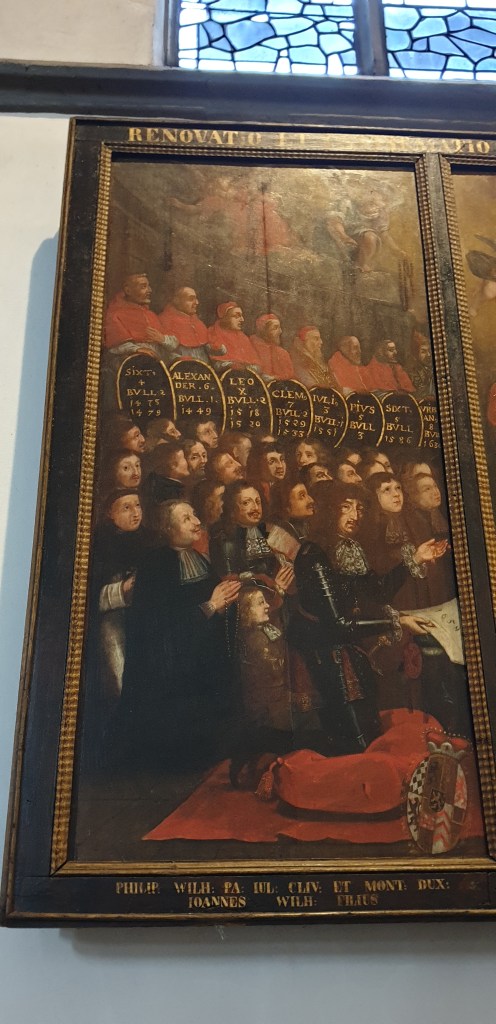 Allerdings muss man nicht in die Ferne schweifen, um einen Blick auf Jan Wellem jr. zu erhaschen. Ein kurzer Spaziergang in die Altstadt mit einem Abstecher in die Lambertuskirche, und da kann man ihn sehen, den kleinen Kurfürstennachwuchs, und das sogar in Farbe. Aber dahinter steckt eine besondere Geschichte. Schauen wir uns dazu folgendes Bild an, das in voller Pracht im nördlichen Seitenschiff von St. Lambertus zu finden ist: