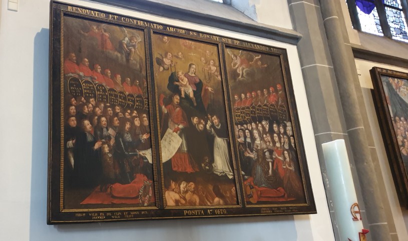 In der Mitte zeigt das Bild Maria, die Mutter Jesu, wie sie dem neben ihr knienden hlg. Dominikus eine Rosenkranzkette überreicht. Mit Hilfe dieser Gebetskette wenden sich bis heute gläubige Katholiken im Rosenkranzgebet an die Jungfrau Maria. Im roten Gewand neben der Gottesmutter steht Papst Alexander VII., der einem Herrn im linken Bildteil die Erneuerungsurkunde der Bruderschaft überreicht, und dieser Herr ist eben kein anderer als Herzog Philipp Wilhelm, der Vater Jan Wellems. Und wer kniet neben ihm? Sein Sohn – hier offensichtlich noch als Söhnchen – also unser Johann Wilhelm!