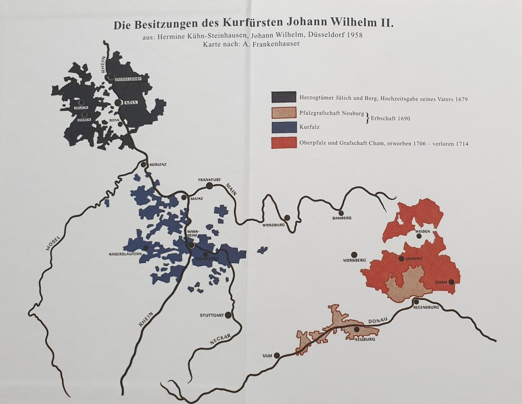 Als Johann Wilhelm II. war er Pfalzgraf, d.h. Herrscher über die Pfalz mit Heidelberg und Mannheim und damit zugleich Kurfürst. Denn der rheinische Pfalzgraf gehörte zu dem exquisiten Klub von seinerzeit acht geistlichen und weltlichen Fürsten, die das Recht hatten, den deutschen König und Kaiser zu wählen. Weiter war er Pfalzgraf-Herzog von Pfalz-Neuburg an der Donau, dem Stammsitz der Familie, und – in unserem Zusammenhang natürlich von besonderem Interesse – Herzog von Jülich und Berg mit der Residenz Düsseldorf. Über die Oberpfalz und die Grafschaft Cham regierte er nur kurz.