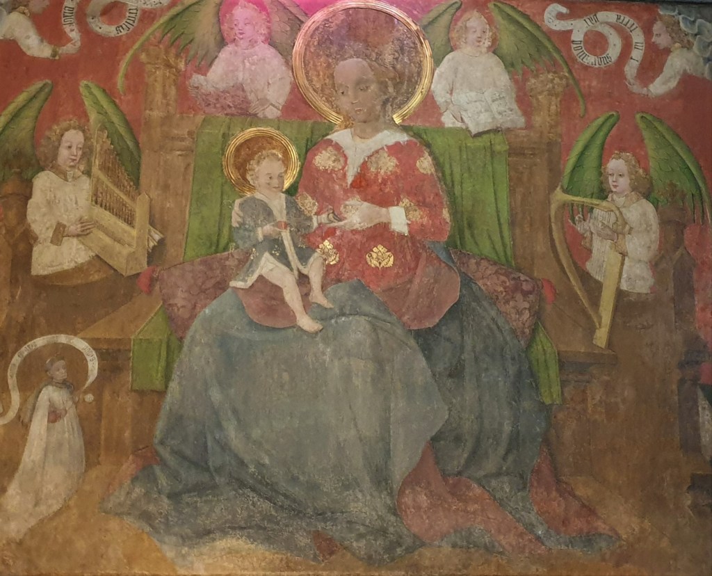 Wandmalerei (nach 1450) in St. Lambertus: Jesus reicht seiner Mutter ein Vögelchen (Foto: Peter Hachenberg mit freundlicher Genehmigung der Pfarre St. Lambertus Düsseldorf