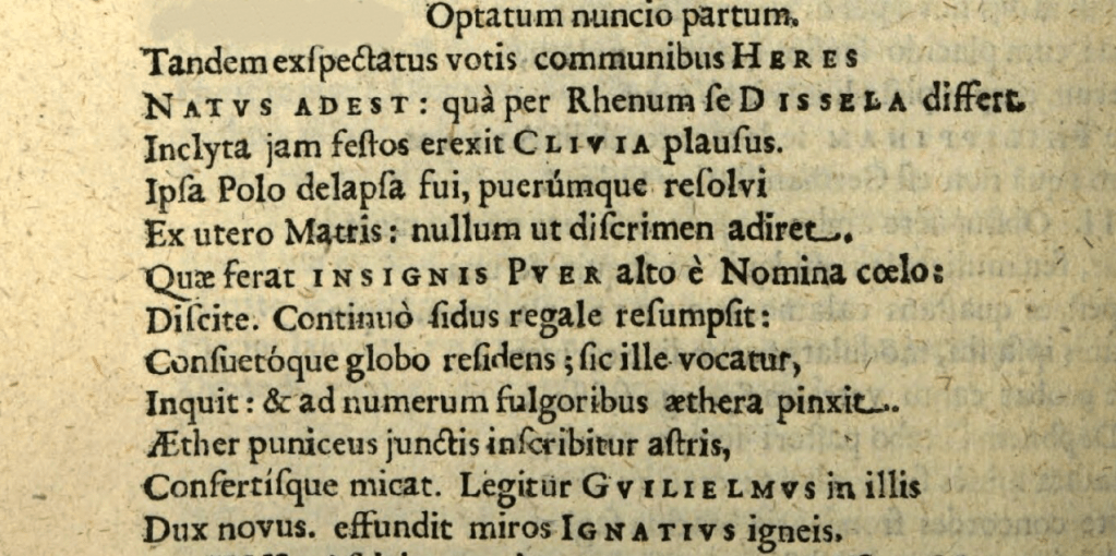 „Die erwünschte Geburt verkündige ich. Endlich ist geboren der von allgemeinen Gebeten ersehnte Erbe; er ist dort eingetroffen, wo die Düssel sich im Rhein auflöst. Schon hat das weitberühmte Cleve festlichen Beifall erhoben. (Die Fürsten von Kleve waren die Vorgänger der Pfalz-Neuburger im Düsseldorfer Schloss/PH)