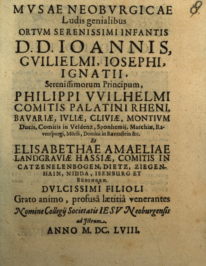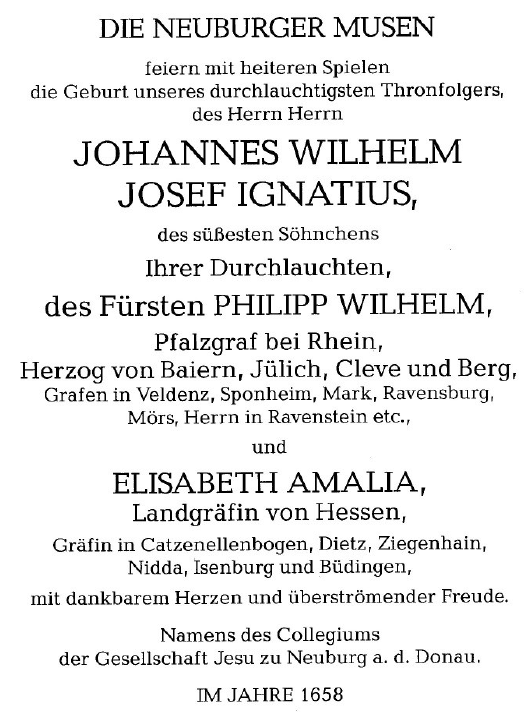 Die Nachricht von der glücklichen Geburt des Prinzen erreicht schnell auch die Stadt Neuburg, wo am dortigen Jesuitenkolleg seit 1654 der Jesuitenpater und europaweit gerühmte Dichter Jacob Balde als Hofprediger und Beichtvater des Herzogs wirkt.