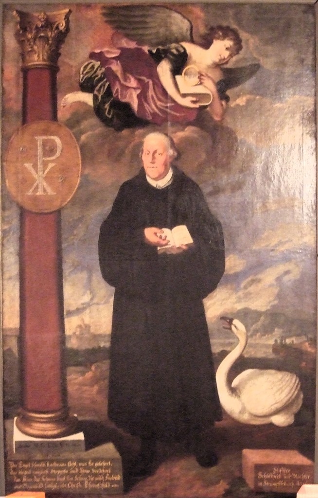 Die hinter dem Spottnamen „Gans von Eisleben“ stehende Geschichte ist folgende: Der tschechische Reformator Johannes Hus wurde während des Konzils in Konstanz 1415 als Ketzer auf dem Scheiterhaufen verbrannt. Vor seiner Hinrichtung soll er geäußert haben: „Heute bratet ihr eine Gans (tschechisch „husa“), aber ein Schwan wird aus der Asche wird auferstehen.“ Dieses Bild des Schwans ist dann später auf den in Eisleben geborenen Martin Luther bezogen und oft in der bildenden Kunst verwendet worden. Balde dreht das Bild wieder um und macht aus dem Schwan nicht ohne eine gewisse Boshaftigkeit von Neuem eine Gans.