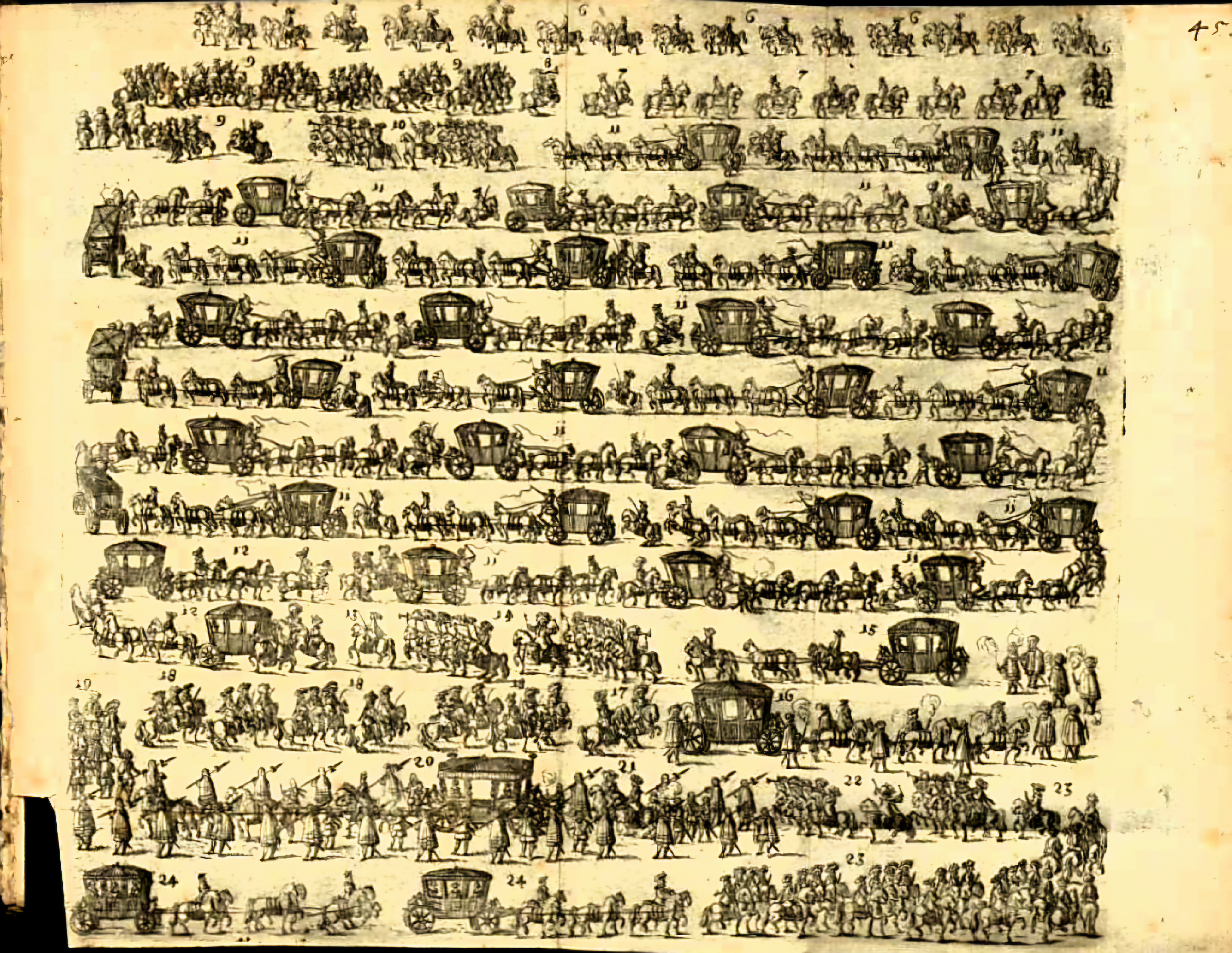 Der Einzug der so Erwählten in die Stadt, wo sie am Eingang der kurfürstlichen Residenz, in deren Hofkapelle die Trauung stattfindet, von Leopold erwartet wird, umfasst einen Zug mit fast 40 prächtigen Karossen, von denen die Brautkutsche in der Grafik Lerchs mit der Nr. 20 gekennzeichnet ist – vorletzte Reihe in der Grafik.