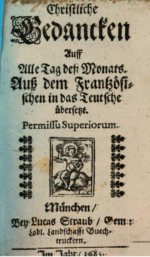 Bouhours, Dominique: Christliche Gedancken Auff Alle Tag deß Monats, Auß dem Frantzösischen in das Teutsche übersetzt [Eleonora Magdalena Theresia Pfaltzgräfin] München (Straub 1685) Digitalisat: https://www.digitale-sammlungen.de/de/view/bsb10172901?page=,1