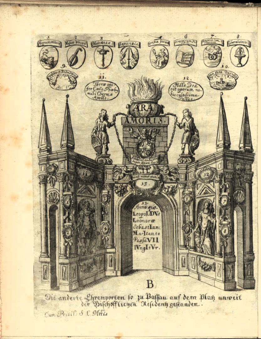 Der schlicht und persönlich gehaltene zweite Ehrenbogen birgt in dem gesprengten Giebel ein Tempelchen (Ädikulum) mit der Büste Leopolds I. Im Balken darunter die lateinische Inschrift „Veni electa mea et ponam in te tronum meum“, also etwa: „Komm meine Erwählte, und ich werde Dich auf meinen Thron setzen.“ Über allem wacht der kaiserliche Doppeladler. Im Vergleich dazu sind die in Passau aufgestellten Bögen wesentlich üppiger, hier die „Ara Amoris“ (Altar der Liebe) betitelte Ehrenpforte unweit der bischöflichen Residenz: