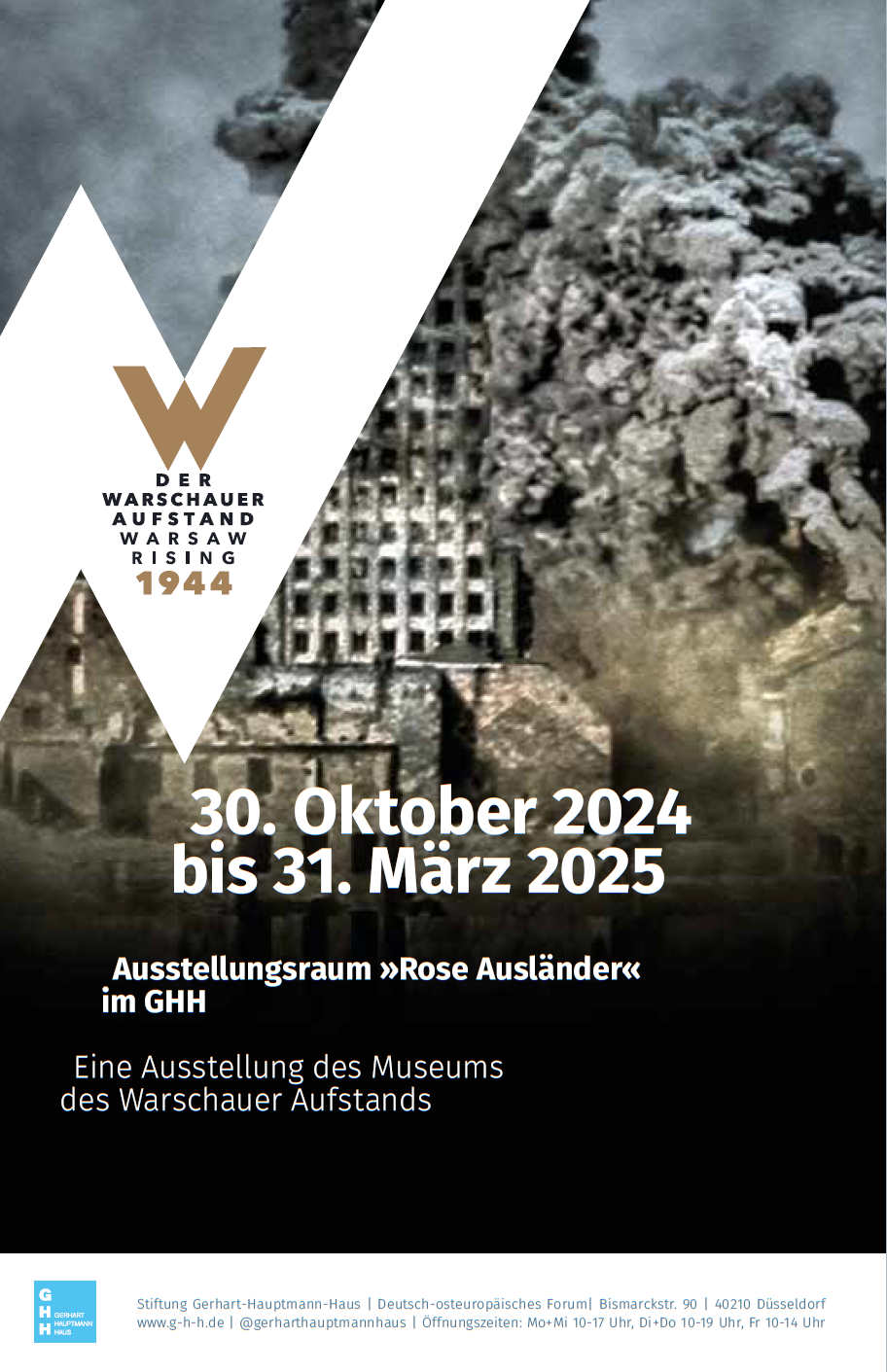 Am 1. August 1944 um 17 Uhr beginnt in Düsseldorfs Partnerstadt Warschau der Aufstand gegen das deutsche Terrorregime. Das Gerhart-Hauptmann-Haus auf der Bismarckstraße zeigt dazu bis zum 31. März 2025 in Zusammenarbeit mit dem Polnischen Institut Düsseldorf und weiteren Institutionen eine beeindruckende und berührende Ausstellung des Museums des Warschauer Aufstandes aus der polnischen Hauptstadt, die am 30. Oktober u. a. von OB Stephan Keller und Rafał Trzaskowski, dem Stadtpräsidenten von Warschau, eröffnet wurde. Wer aus der Geschichte lernen und auch ein wenig die heutige polnische Seele verstehen will, kann das in dieser sorgfältig kuratierten Ausstellung mit gut verständlichen deutschen und englischen Texten.